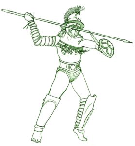 A Nivel III obtiene un ataque de Lanzazo (aumenta sus dados de ataque); con su Puñal bajo el Escudo (contraataca con 1 dado de ataque) puede disuadir a sus rivales; y su habilidad de Falange Hoplita le concede siempre +2 Mantenerse en Pie adicionales, por lo que es muy difícil de derribar. Esta gladiadora comienza con una fabulosa lanza (arma Larga y Afilada), y su Puñal bajo el Escudo, por lo que es muy buena a Nivel I: la mejor opción si no hay dinero suficiente en la bolsa para entrenarla.
